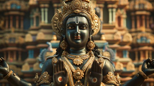Imagine the pivotal moment when a divine vision interrupts the king's plans. Visualize the resplendent form of Vishnu appearing, requesting a single temple in Thirunarayur. Picture the transformation in the king's demeanor as humility replaces determination. Envision the king obediently redirecting his efforts to build a magnificent ode to the preserver, Lord Vishnu. full hd, 8k, 35mm, realistic, cinematic --ar 16:9 --v 6.0