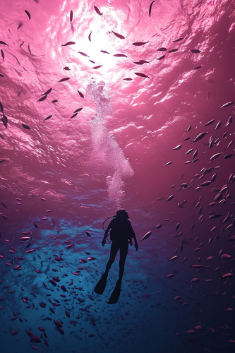 diver with school of fish circled in heart shape under pink water, bright tone, volumetric light, illustration style --ar 2:3 --s 250 --v 6.0 --style raw