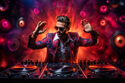 a realistic picture captured by a photographer, in a busy night of Hong Kong back in 1980s, 2 DJs playing music on the street with people partying and dancing in front of them. --ar 9:16 --v 6.1