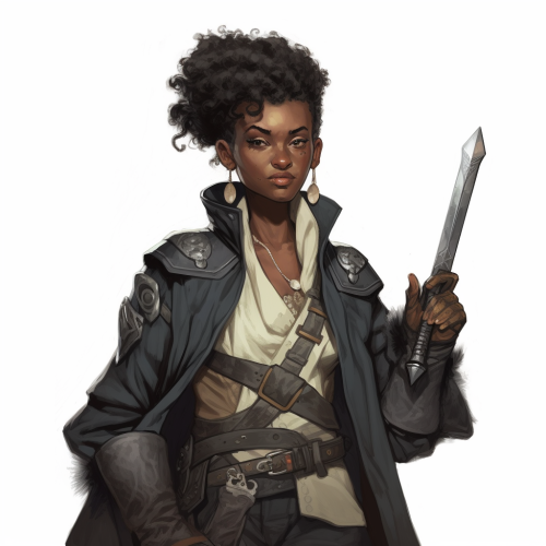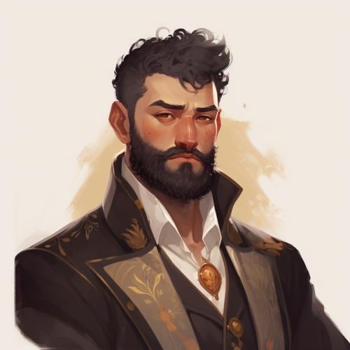 dnd character, black tweed suit, gold floral trim, buzzed hair, bearded, tan skin, white background, portrait, global lighting --v 5.0