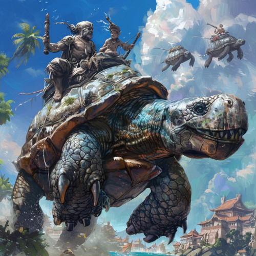 d&d vanaras on giant battle turtles as Guild Wars luxons, south-east asian style