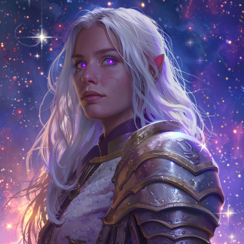 Medieval Fantasy, D&D Fantasy Style, white haired elven woman, purple eyes, astral background, Cleric, battle-worn Mithril armor
