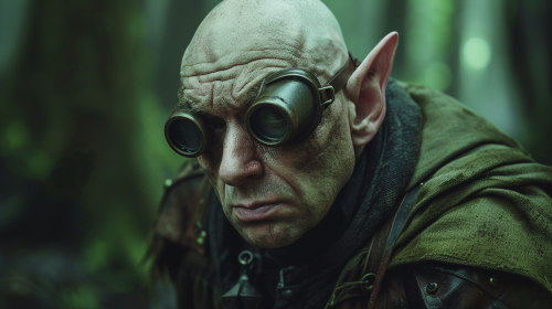 dynamic photorealistic movie still of a handsome bald elf with dark steampunk goggles looking exhausted and sad in a fey forest at twilight, pointy elf ears, green cloak and leather armor, cinematic lighting --ar 16:9 --v 6.0
