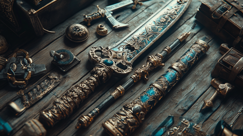 d&d weapons, loot, 4k, vivid, 4k ultra detailed, 4k cinematic, 4k hyper detailed, 4k ultra realistic, 4k hyper realistic, 4k photorealistic, --ar 16:9 --v 6.1