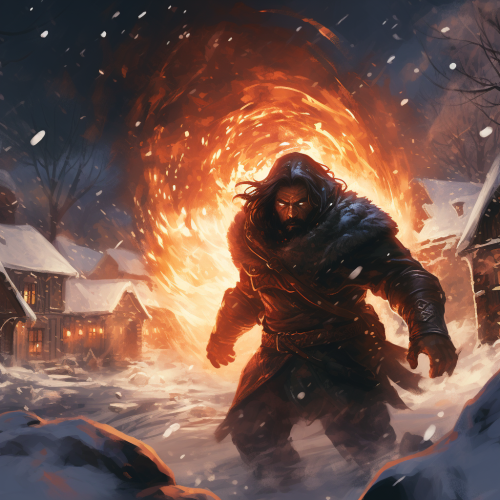 a barbarian mage, attacking the viewer by casting ice spells, a village on fire in the background, snow, night, first person POV, dnd