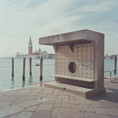 Editorial, extorior view documentary photography, in Venice, cinematic, by Todd Hido style, concept design of public toilet as a small pavilion in a venice calle , piazza, alongside the canal, retro-futuristic style photography in cinematic tones cinematic, parametric tessellation architecure, concept design, portaluppi inspired, innovative materials --chaos 10 --v 6.0