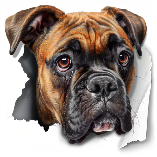 A realistic boxer and malinois mixed dog is poking its head through a hole in the style of a wall sticker. The style is simplified, cute, friendly and resembles cartoons. The image should have a white background