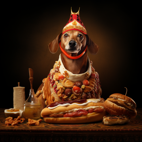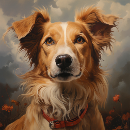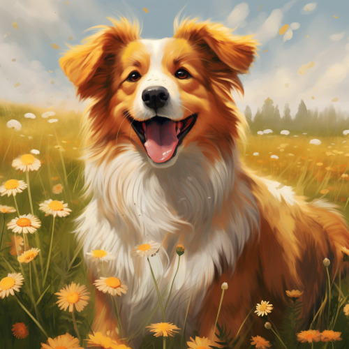 corgi australian sheperd mix orange dog with white spots in a field of dandelions, realistic