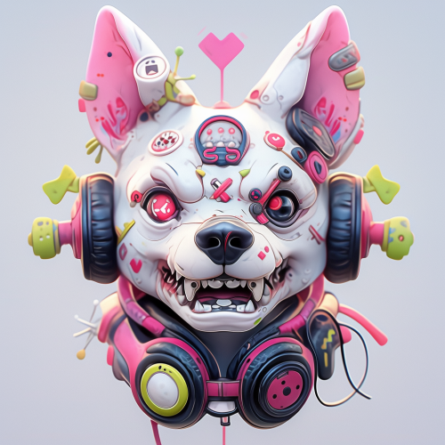 an avatar of a dog with some buttons on its ears, front view, in the style of mike campau, white and pink, unique character design, realistic anamorphic art, modern jewelry, text and emoji installations, neo-geo, --niji