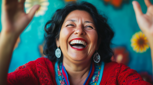 A mexican family. There is an old woman, two brunette ladies, and two young boys of ages 11 and 13. The family is celebrating a birthday party. There is a handsome man with a bald head. The decor is very festive and colorful.