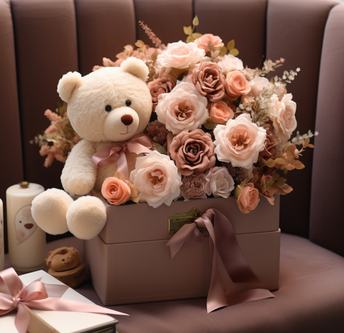 a brown box with a teddy bear sitting in a flower art basket, in the style of dark beige and pink, dau al set, ocean academia, happycore, hallyu, romantic academia, captivating --ar 40:39