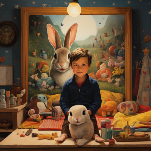 Image of a cute realistic rabbit with a happy kid in the background, in a bedroom tiny but full of colored items. A sentence in french is written in the bottom of the image : "Je suis importante, courageuse et bienveillante"