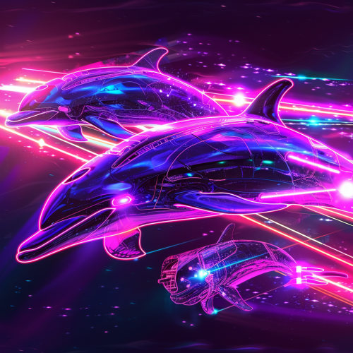 futuristic robotic neon-soaked and laser beam equipped pod dolphins with one dolphin leading the bad and its badass, use bright pinks and purples and blues
