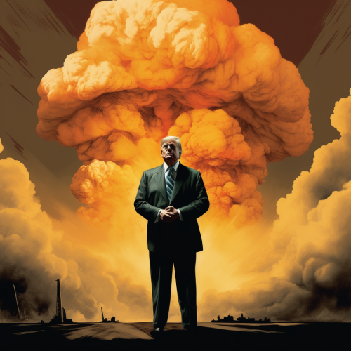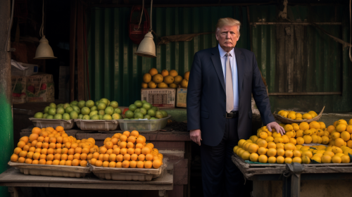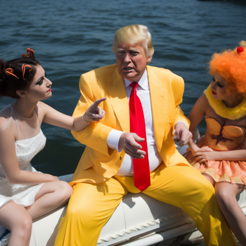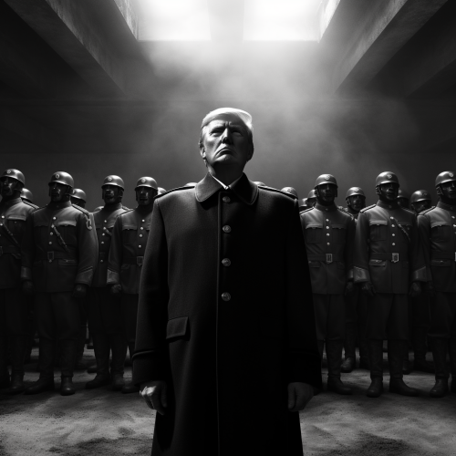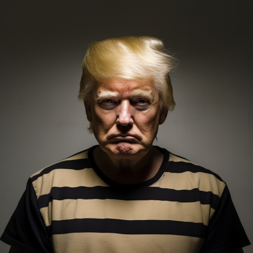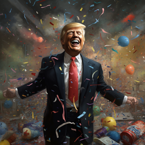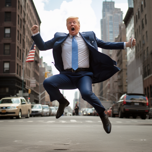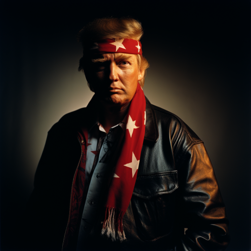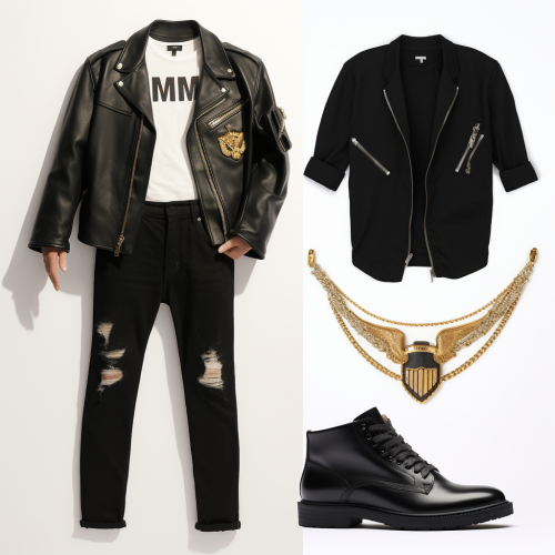 Donald Trump - Urban Maverick Distressed, black denim jeans with gold-embellished stitching. A tailored, black leather jacket with gold zippers. A white graphic tee with a bold, graffiti-style "45" (in reference to his presidency) design. Black combat boots with gold-plated accents. Aviator sunglasses and a black snapback cap with a gold "45" logo.
