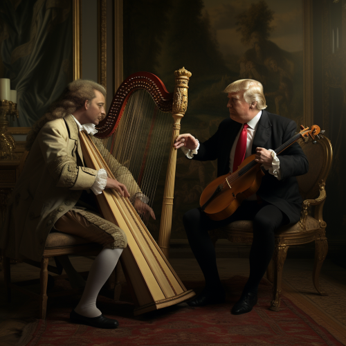 Donald Trump playing the harp in the XVII century in front of Louis 14.