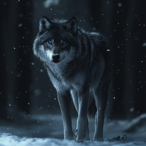 create a person in the form of an ultra-realistic wolf, with a background as if he were walking through darkness in black, silver and blue, I want this image in 4k