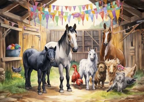 birthday scene in barnyard with horses, cats, chickens, donkeys, dogs styled by watercolors --ar 7:5 --v 5.2