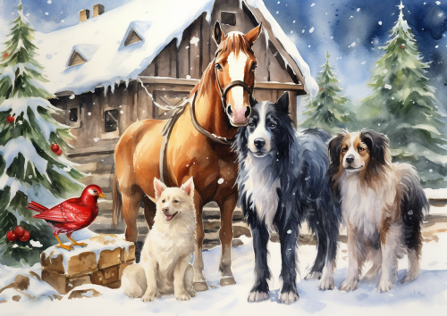 christmas scene in barnyard with horses, cats, chickens, donkeys, dogs styled by watercolors --ar 7:5 --v 5.2