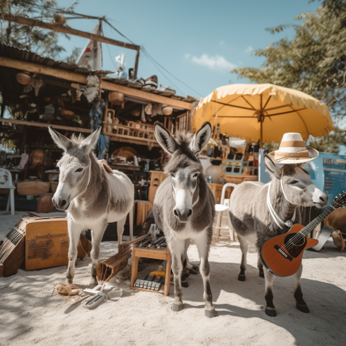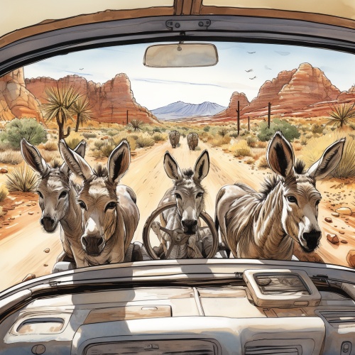 illustration from inside of a car, with donkeys putting their heading through the open car window, with an arizona desert in the background