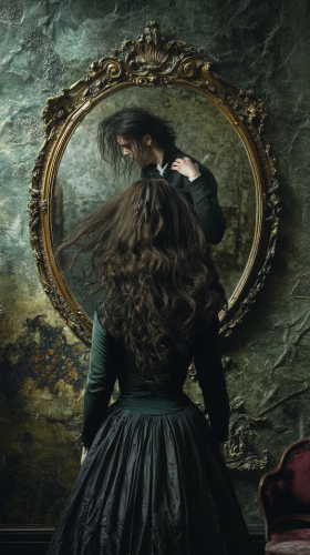 l'immagine deve contenere un uomo e una donna davanti uno specchio. La donna è obesa con lunghi capelli neri. L'uomo invece alto e con capelli biondi. Immagine realistica. --ar 9:16