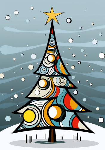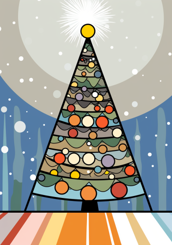 Roy Lichtenstein, Flat, Vector, architects christmas tree in snow, lights and balls of glass, in the style of Andy Kehoe and Ruth Thompson, cartoon, stylized, Pixar, Picasso, intricate detail, stained glass, Graphic design, iPhone Wallpaper, muted light colours, light muted colours, summer, --ar 21:30 --s 50