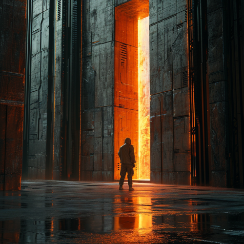 a man dressed in futuristic tan and brown clothing standing at a door in a towering jet black structure, glowing orange light is radiating out of the open door, in the cinematic style of Rodger Deakins, cinematic, minimalist, photorealistic --v 6.0