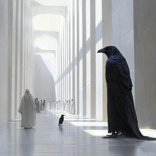 an anthropomorphic raven man and a small bird woman, along with other people enter into a large white hallway aligned with many doorways | they look around in wonder of their surroundings
