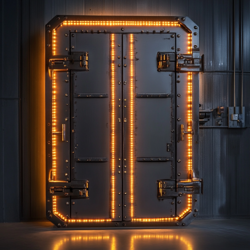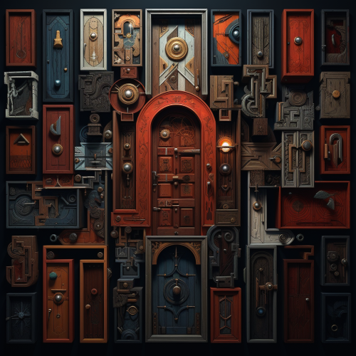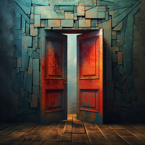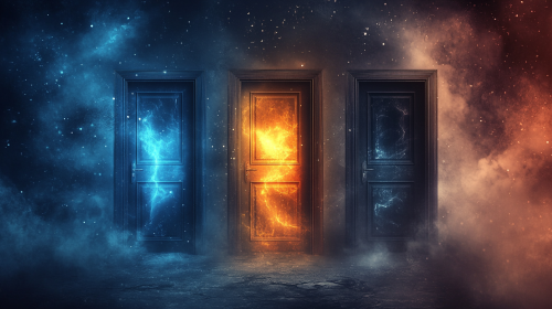 3 doors on an ethereal background, they are half open, one of the doors is glowing with light and represents good, the other two doors are dark and represent evil --ar 16:9