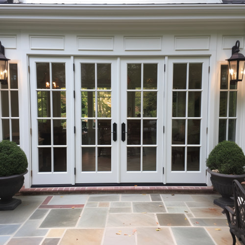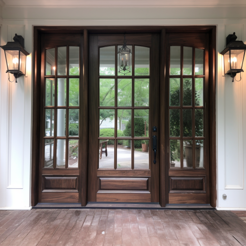 a beatiful set of new french doors with sidelites on either side. include a transom above the door unit. The hardware should be high end. Include elaborate trim work.
