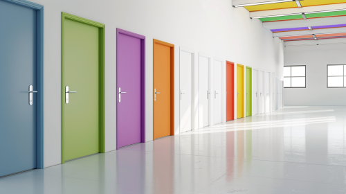 Long white modern simple Corridor with many doors - each door is different colour --ar 16:9 --s 50 --v 6.0