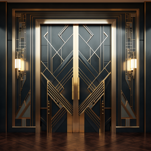 Hotel main entrance, revolving glass doors, marble floors, doorman station, brass fixtures, potted plants, point of view, photorealistic, stunning, 8k, award-winning, dramatic