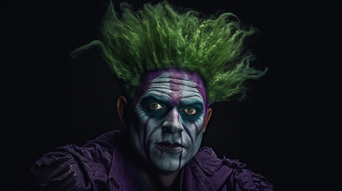 A captivating, high-resolution image of a clown with a death grimace. The emerald green hair stands out vividly against a deep lavender costume and a charcoal gray background. Emphasize the haunting emotion, shot with a Canon 5DS R, cinematic horror style. 8k . --ar 16:9 --v 5.1 --style raw --s 750