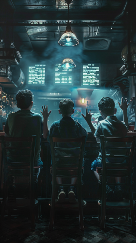 Cinematic, FULL BODY SHOT, SIDE POTRAIT, sitting at the table in a bar three boys raise their right hands looking at the waiter --ar 9:16
