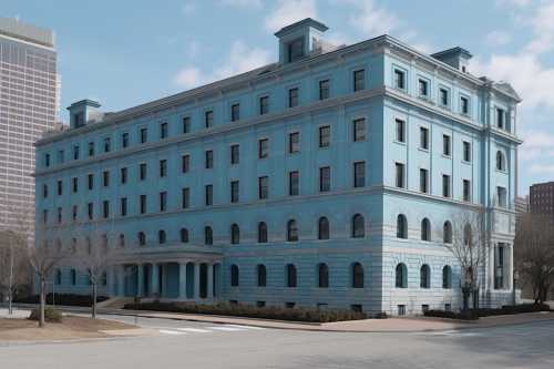 a grand bank building in downtown Boston, Federalist style, blue brickwork, white stone magnolia trim decoration, high detail, 4k, --v 5.0 --ar 3:2