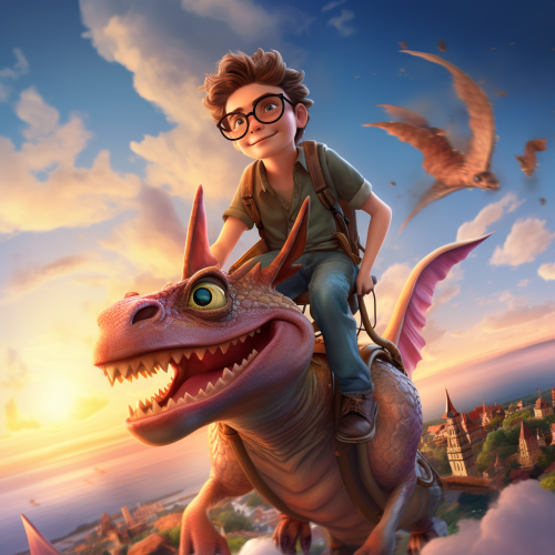 teen-age boy wearing glasses riding on a dragon high in the sky, pixar style