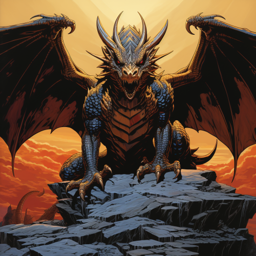 **angry dragon is sitting on the chest of gold, wings on his back, looking straight to the camera, in the art style of Steve Rude, --no human --s 250