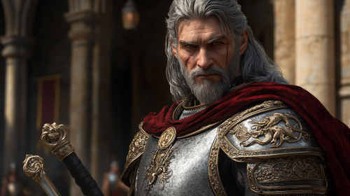 Baldric the Brave, featuring an elegant and slender build with a rugged face and a prominent scar. He has sharp gray eyes, long silver-blond hair, and a slender, well-groomed beard with gray flecks. His silver plate armor is intricately engraved with dragons and lions, polished brightly. He wears a deep red velvet cloak with gold trim and holds an ornate longsword and a lion-crested shield, standing in town square, dnd town, style of octane render, Pose him heroically, --ar 16:9