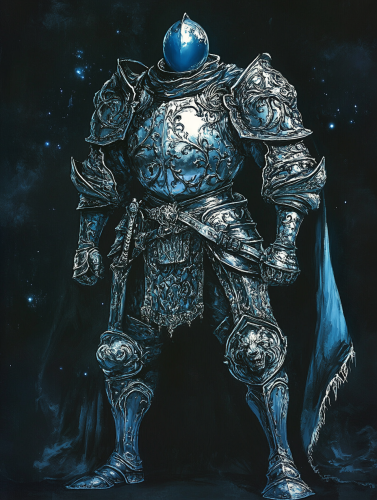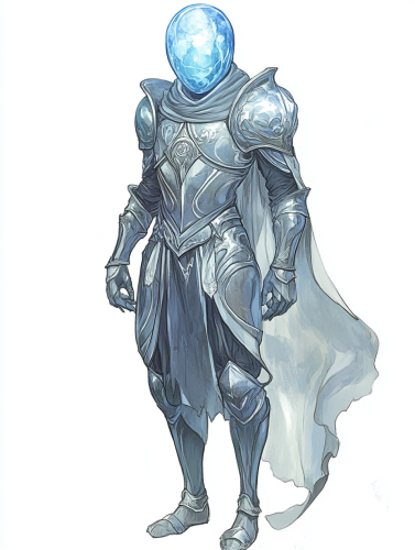 A hand-drawn stylized dungeons and dragons character portrait in the style of Capcom's Breath of Fire concept art: a glistening blue plasmoid figure with no face, just a blob head in an ornate shining suit of silver knight's armor, the background is dark and celestial --ar 3:4