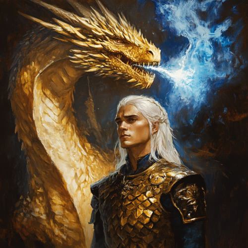 medieval gothic renaissance painting, game of thrones, daemon targaryen wearing a dragon scale tunic standing in front of a golden dragon blowing blue flames, mid length white hair