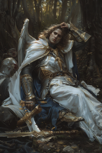 "anime A regal young female knight with long, flowing blonde hair styled in a braid, dressed in intricately designed silver armor, sits confidently. The armor is adorned with ornate engravings and has a polished, reflective finish. She holds a large, decorated shield with gold crosses and medieval symbols.Lively field field.look up at the sky. Her expression is serene yet resolute, her gaze slightly if in big smile look up at the skyin a big way. The background is filled with medieval banners and a blurred battlefield scene, capturing the atmosphere of an epic historical moment. The lighting is soft, with sunlight filtering through, highlighting the intricate details of her armor and the soft texture of her hair.8k".Fullbody 128k Bluray Extreme UHD 8K High quality anime image .--niji5