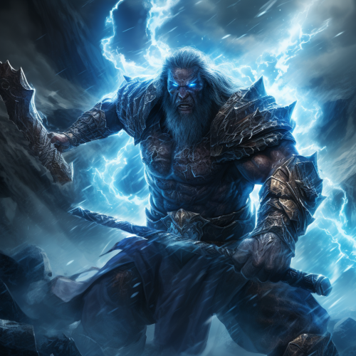 rpg blue scaled dragonborn man barbarian battleaxe lightning angry