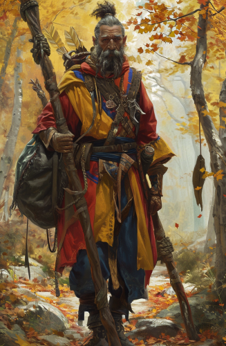 a [dragonlance] Kender. He stands about 3 feet tall. His body is slender, almost childlike. His hair, tied in a topknot adding to his eccentric appearance. His eyes, large and round, shine with an insatiable curiosity, reflecting a world full of wonder. Dressed in colorful, mismatched clothes, he carries a larger quarterstaff and a bag. He is in an autumn forest. In the style of realistic fantasy artwork, kerem beyit, amir zand, mark keathley, realistic hyper-detail, split toning --ar 21:32 --v 6.0 --style raw