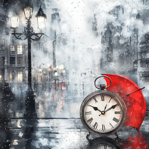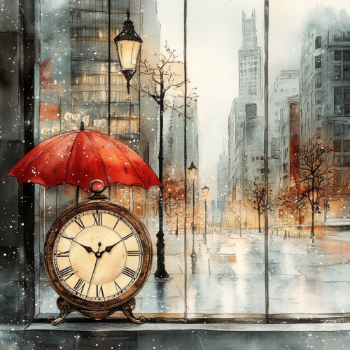 A whimsical illustration of an elegant vintage table clock in an artistic illustration, against a cityscape background with blurred city buildings and beautiful street lights, puddles on the sidewalk, a soft rainy winter fog. A red umbrella stands nearby, creating a pop of color. The scene is seen through a rain-covered window, with soft daylight filtering through gray clouds in a watercolor-style ink and atmospheric winter scene.