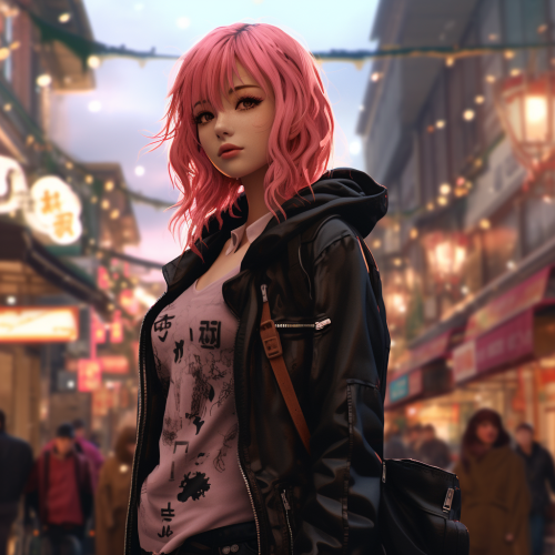 cute girl with pink hair standing in the middle of Kyoto street in manga style, science-fiction, late rainy afternoon, golden hour, 9:16