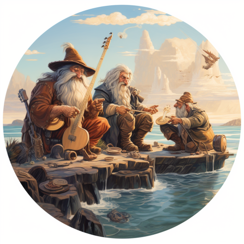 DWARVES PLAYING POGS IN THE LATE AFTERNOON ON A BEACH IN THE PACIFIC NORTHWEST IN THE STYLE OF ROCOCO
