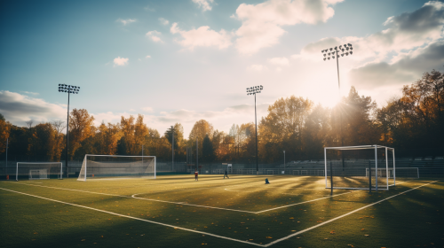 a cinematic photo of a high school soccer field, dramatic, late afternoon back light, soccer goal, --ar 16:9