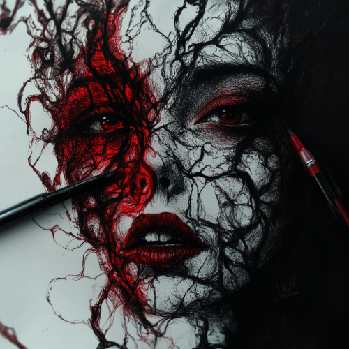 a creepy surreal macabre image close up of a evil female, his face is morphing into a demon, fine pen art work, black and red, dark aesthetic, gothic art, horror art, dark gloomy background, portrait style,