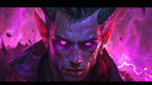 dramatic portrait drawing of a demon character that is a demon handsome man aged 25 with short hair with unnatural scaly skin with purple glowing highlights and glowing bright powerful demonic purple eyes with X shaped pupils, with large demon horns and pointy demon ears, with purple lightning powers with a extremely angry death expression with a scary gaping smile with sharp teeth, in the middle of an intense battle in the style of baldurs gate 3 --ar 16:9 --s 500 --v 6.0