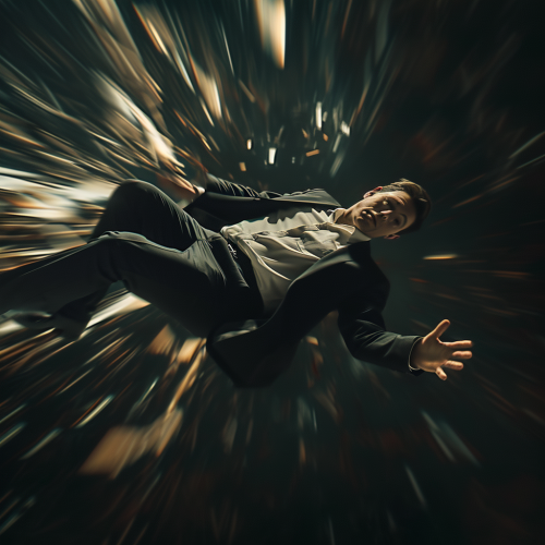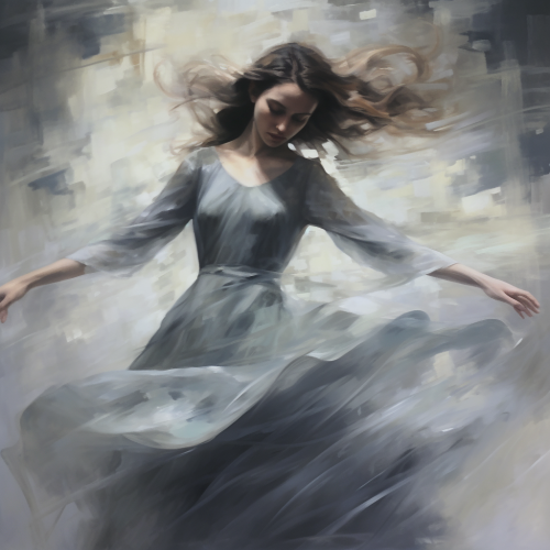 a blurry painting of a woman falling. Grey colours. Blurry background. She falls horisontal