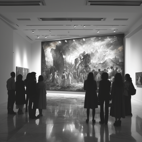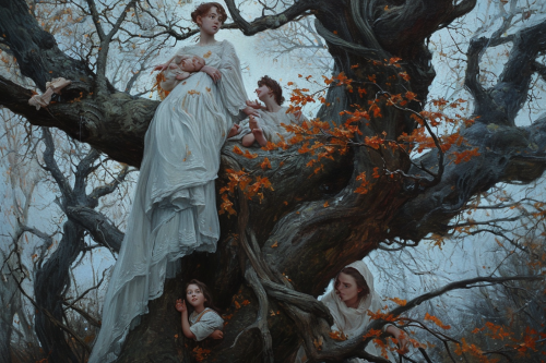 a stunning interpretation of a family beeing inbraced by community in their time of need, dynamic, Alphonse mucha + Tomasz alen kopera + Stefan Gesell, wet on wet oil painting, key colors black and browns, fear + terror + dread, dramatic lighting, cinematic, salvador dali --v 6.0 --chaos 30 --ar 3:2